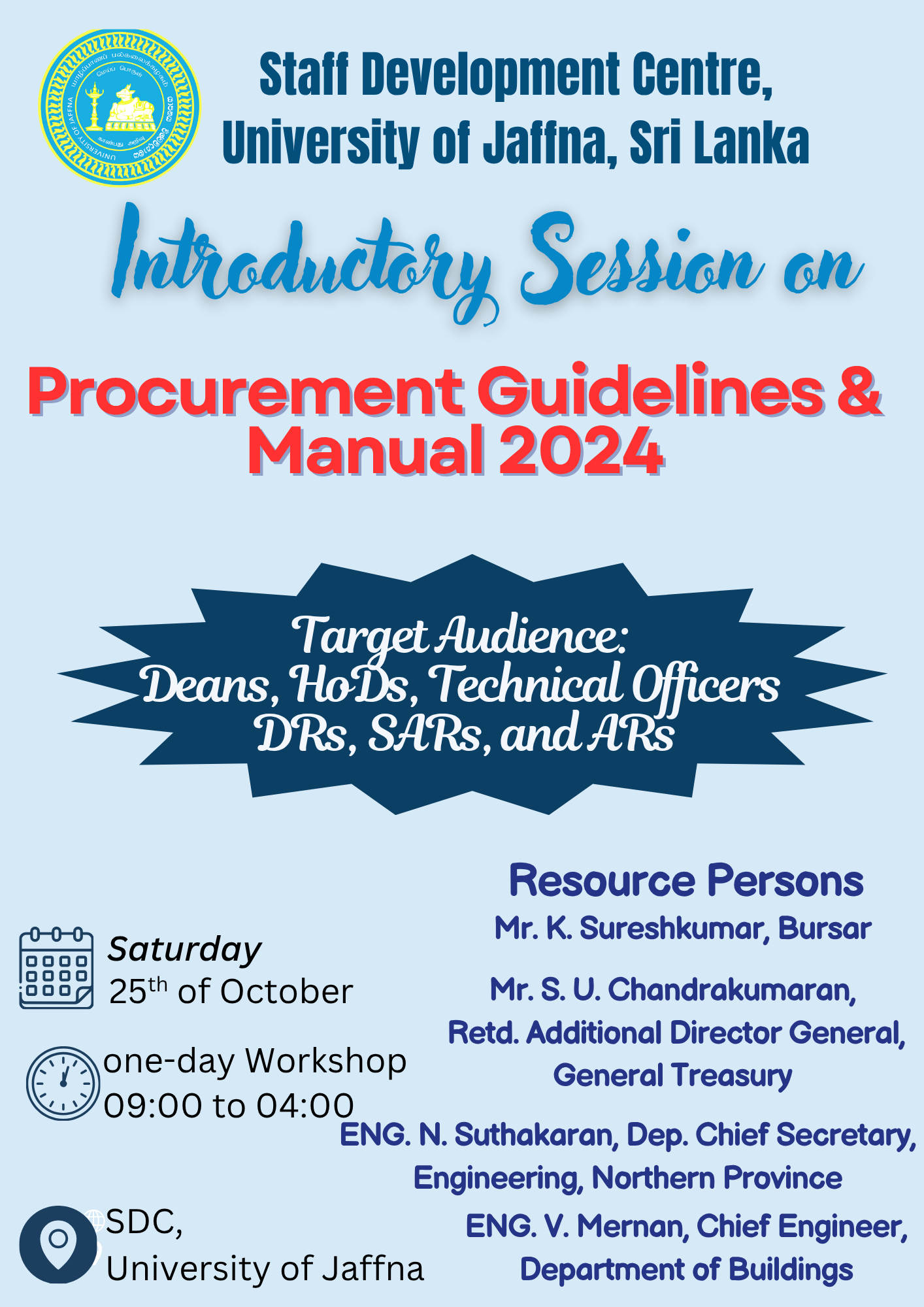 The main objectives of the SDC are to engage in continuous improvement of the human resources capacity of the University of Jaffna and thereby promote allegiance of the staff to the University’s vision and core values; introduce modern and innovative technologies and tools into the business of the University, and thereby improve the relevant knowledge and competencies and attitudes of the all categories of staff at all levels to provide the best learning experience to the students.